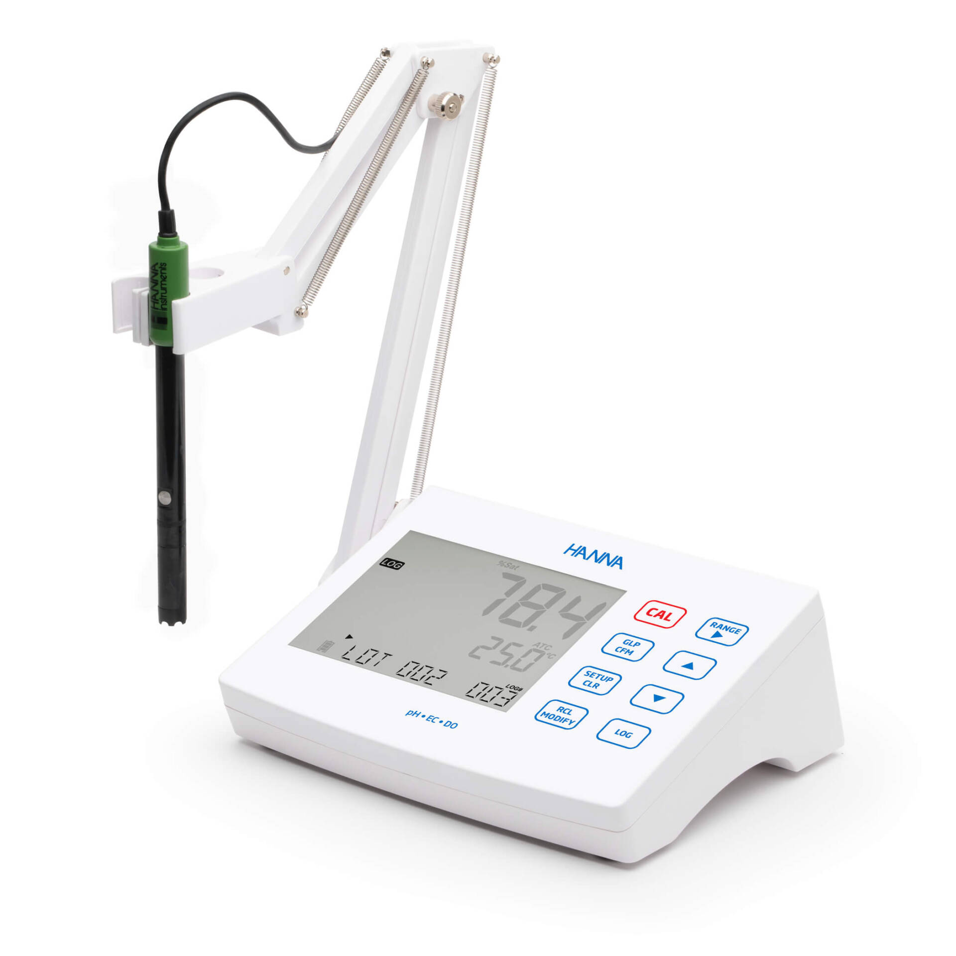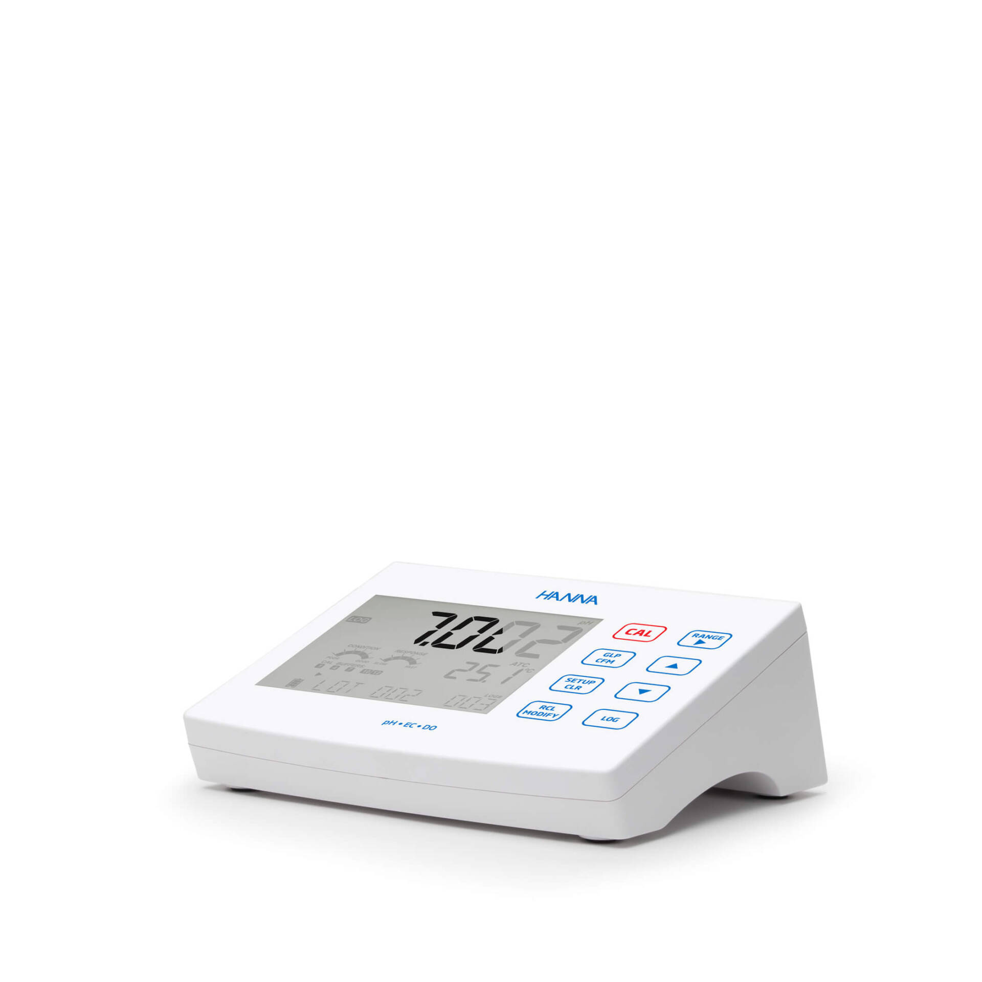 La función exclusiva CAL Check de Hanna analiza la respuesta del electrodo de pH en los tampones de calibración para detectar posibles problemas, como soluciones contaminadas o electrodos sucios. Una vez completada la calibración, en la pantalla de medición se muestran indicadores que reflejan el estado de la sonda, basados en su desviación y características de pendiente— se muestran en la pantalla de medición.